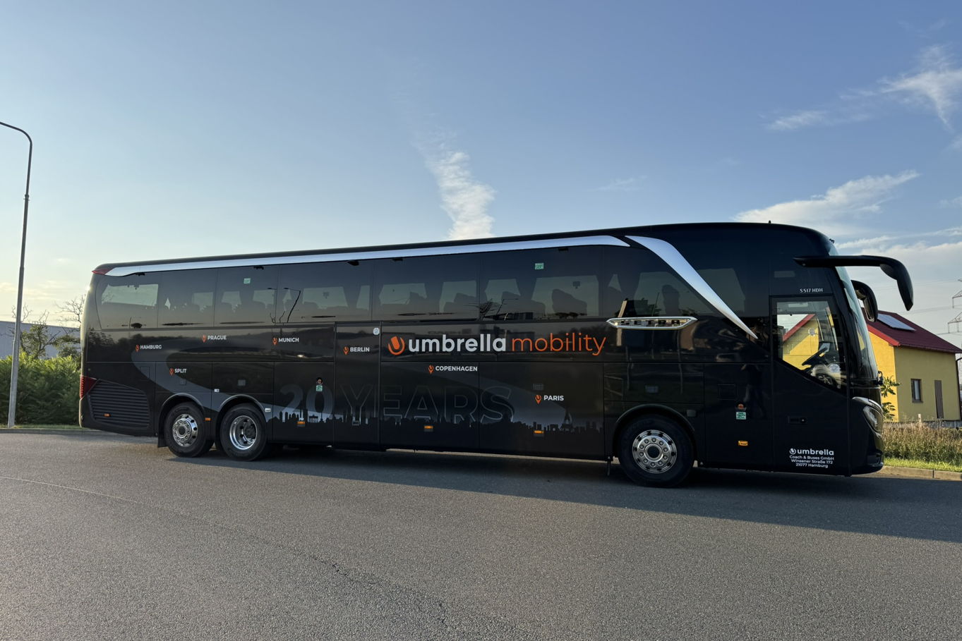 Umbrella Mobility proudly celebrates its 20th anniversary and, on this occasion, introduces an exclusive anniversary bus provided by SETRA for this milestone. This special bus stands out not only for its luxurious design but also for its symbolism, reflecting the company's European reach and innovative approach.